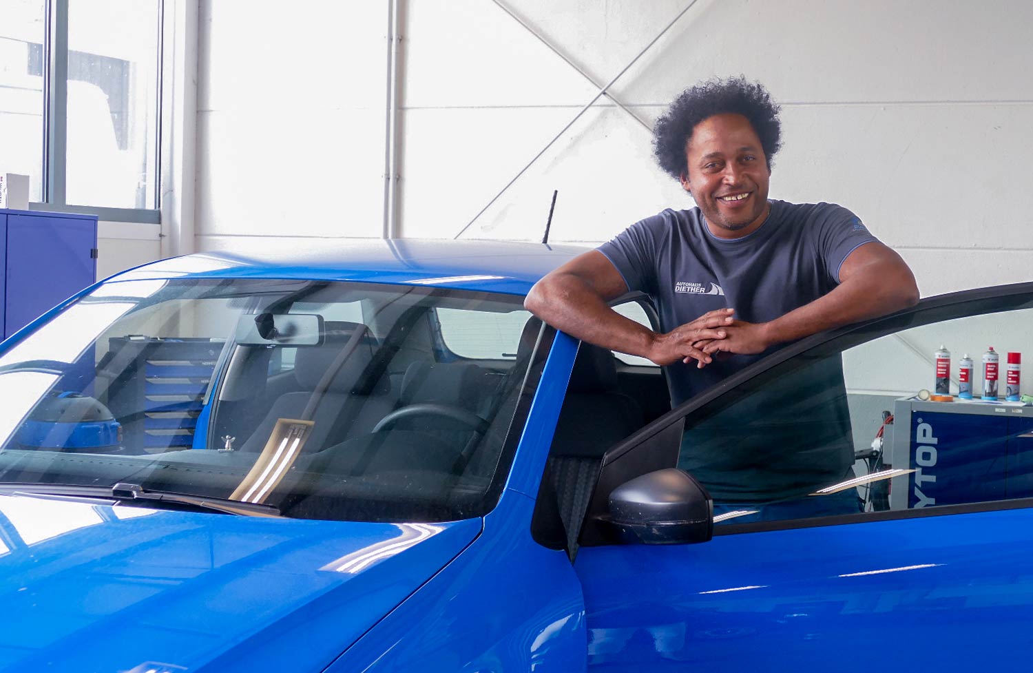 Ihr Ehrgeiz sind blitzblanke, fast wie neu aussehende Fahrzeuge – dafür legen sich die Mitarbeiter der Fahrzeugaufbereitung von Autohaus Diether täglich ins Zeug. Jetzt hat das Team, das im BlueDrive Center in der Adlerstraße tätig ist, Verstärkung bekommen. Antonio, kurz Toni, bringt seit zwei Monaten täglich gute Laune und bereits Erfahrung in der Fahrzeugaufbereitung mit. Die Einarbeitungszeit hat der gebürtige Kubaner, der bereits seit zwölf Jahren in Deutschland lebt, erfolgreich durchlaufen, bereits den einen oder anderen Tipp zur professionellen Fahrzeugpflege von den Kollegen erhalten und er fühlt sich in dem Multikulti-Team sichtlich wohl. „Es ist super hier, wie in einer großen Familie“ schwärmt er mit einem ansteckenden Lächeln.