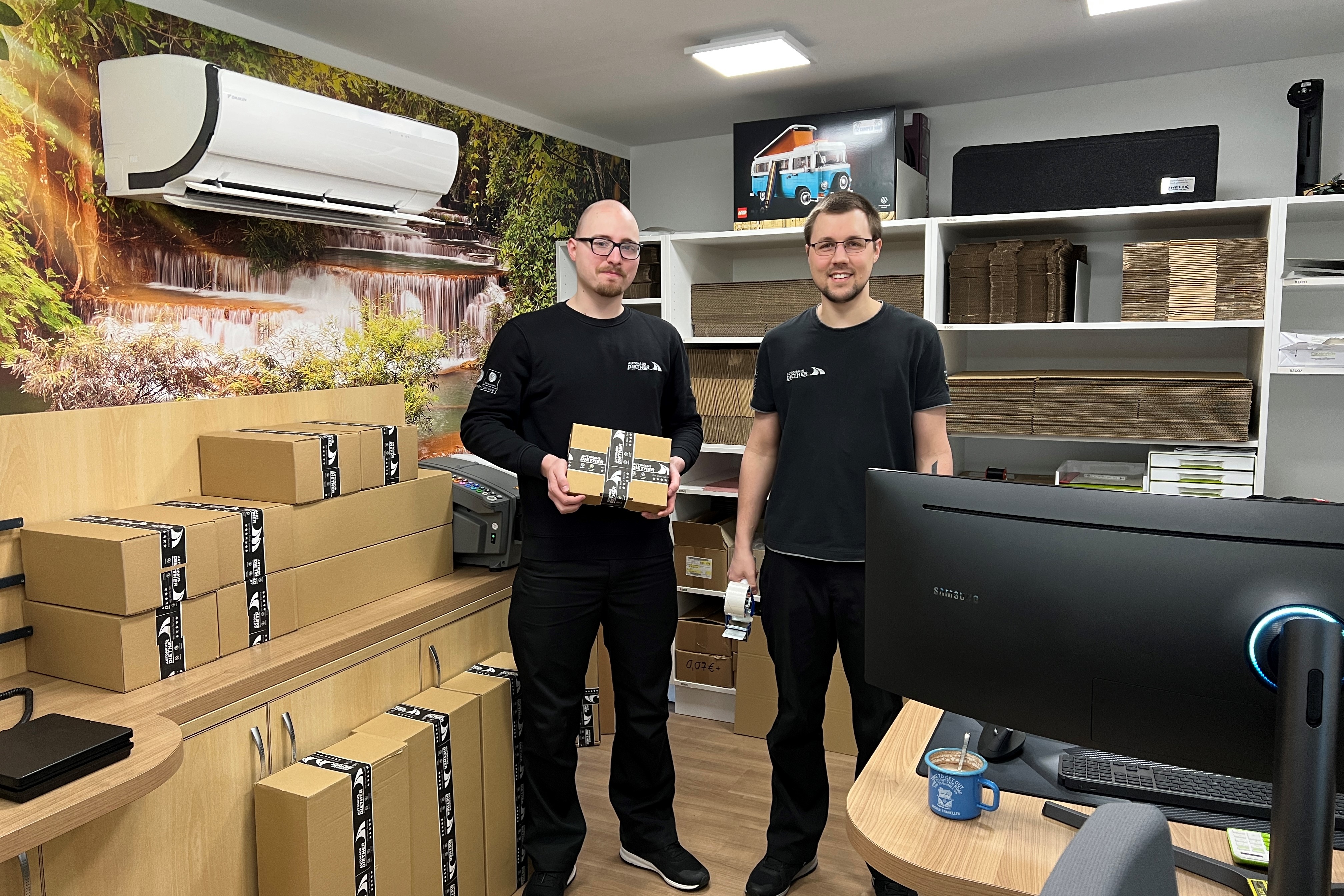 Wir vom Autohaus Diether haben viele Stärken. Die meisten davon bekommen unsere Kunden hautnah mit, wenn sie unseren tollen Service und die guten Werkstattleistungen in Anspruch nehmen. Aber wir haben auch Stärken, die nicht gleich ins Auge springen. Stefan Gierig etwa, der, zugegebenermaßen etwas versteckt in seinem kleinen, aber gut bestückten Büro, den E-Commerce aufgebaut und super zum Laufen gebracht hat, ist so ein Starker im Team. Er macht seinen Job so gut, dass er jetzt Unterstützung aus den eigenen Reihen bekommt. Michel Andre Reß, der bei uns seine Ausbildung absolvierte und somit schon Erfahrungen im Teile- und Zubehörbereich gesammelt hat, ist ab sofort der zweite Mann an Bord. Die beiden nehmen Online-Bestellungen für Zubehörteile entgegen, packen und verschicken die Ware anschließend mit viel Liebe. 😜
