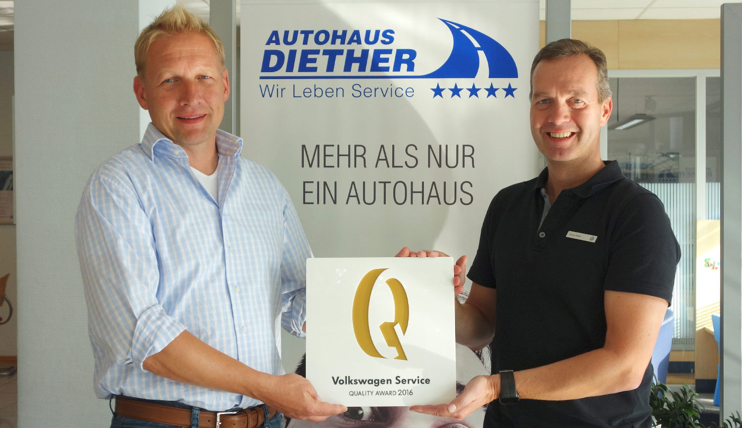 Die Auszeichnung „Volkswagen Service Quality Award“, kurz VSQA, ist etwas ganz Besonderes, schließlich wird der Award jedes Jahr weltweit an nur 100 Volkswagen Service Betriebe vergeben. Wir sind daher sehr stolz darauf, 2016 zu den ausgezeichneten Betrieben zu gehören. Und dies nach 2011 bereits zum zweiten Mal – das ist bislang nur ganz wenigen Volkswagen Service Betrieben gelungen! Wir danken Ihnen, liebe Kunden, dafür, dass Sie bei den Kundenzufriedenheitsbefragungen mitgewirkt und unsere Leistung so positiv bewertet haben. Der Award basiert ausschließlich auf der Auswertung dieser Befragung und bestärkt unser Team darin: Diethers‘ Service ist auf einem guten Weg. Danke!